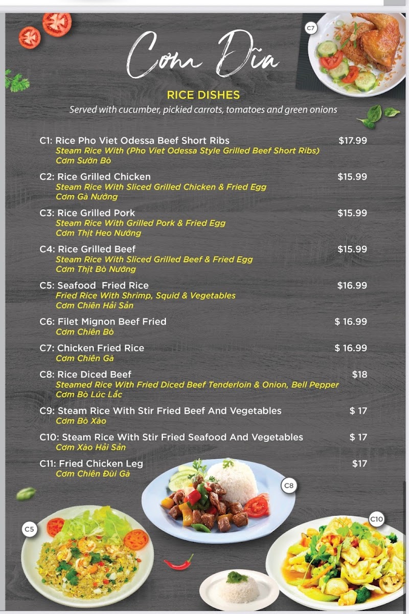 At Pho Viet Odessa, the menu offers a relaxed and straightforward Vietnamese dining experience that’s perfect for any time of day. Whether you're in the mood for a comforting bowl of pho on a cool evening or a light, fresh vermicelli noodle bowl for lunch, the menu balances traditional flavors with casual, approachable dishes.